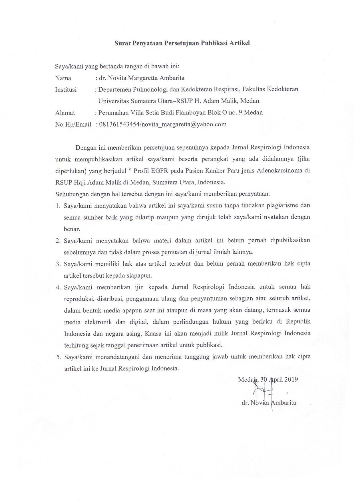 - Articles are published electronically for open access and online for educational, research, and archiving purposes. Jurnal Respirologi Indonesia is not responsible for any copyright issues that might emerge from using any article except for the previous three purposes.