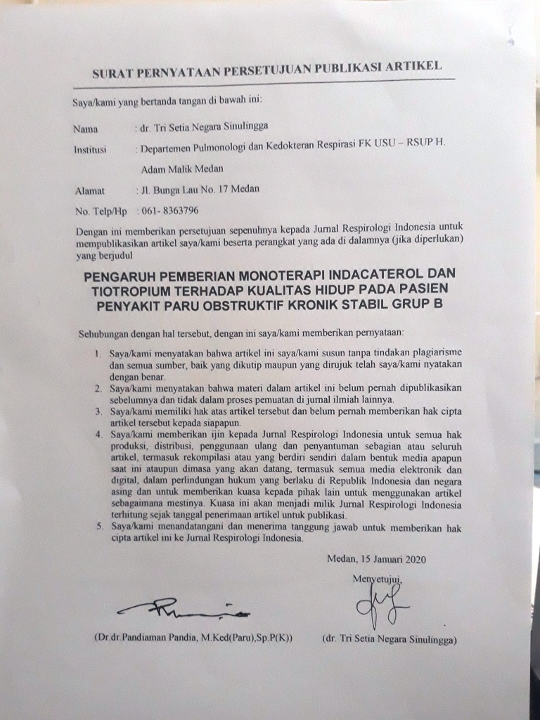 - Articles are published electronically for open access and online for educational, research, and archiving purposes. Jurnal Respirologi Indonesia is not responsible for any copyright issues that might emerge from using any article except for the previous three purposes.
