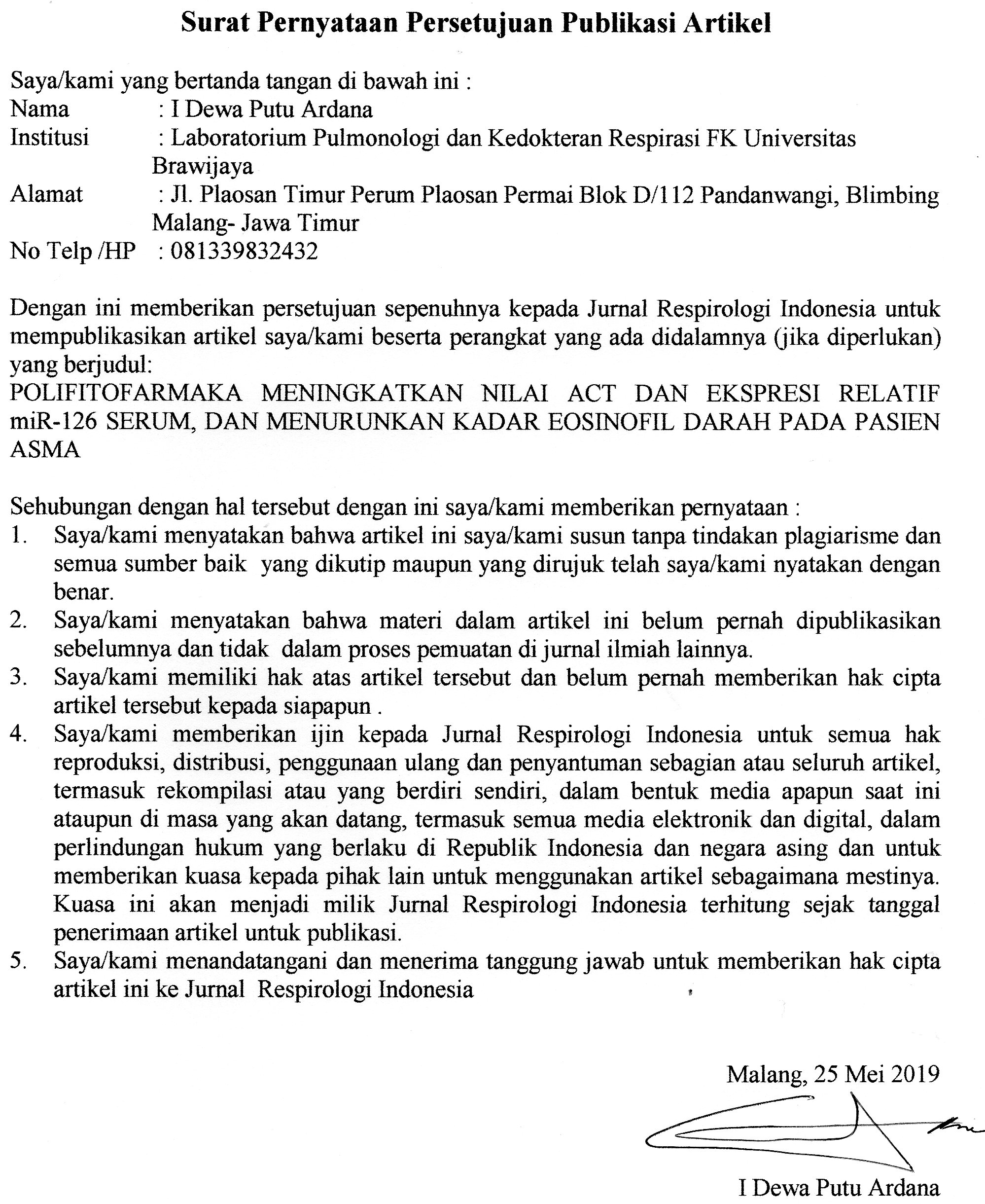 - Articles are published electronically for open access and online for educational, research, and archiving purposes. Jurnal Respirologi Indonesia is not responsible for any copyright issues that might emerge from using any article except for the previous three purposes.