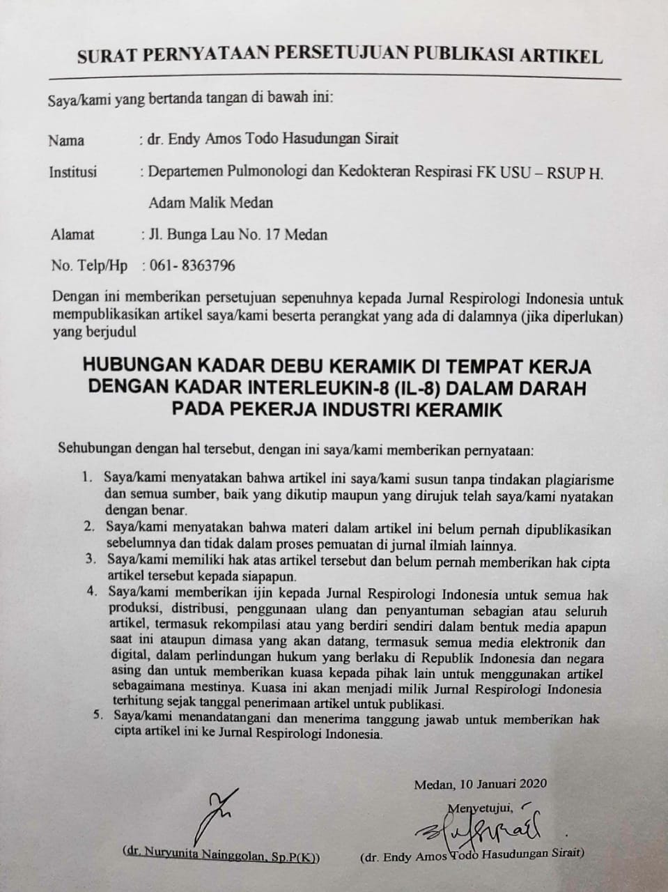 - Articles are published electronically for open access and online for educational, research, and archiving purposes. Jurnal Respirologi Indonesia is not responsible for any copyright issues that might emerge from using any article except for the previous three purposes.