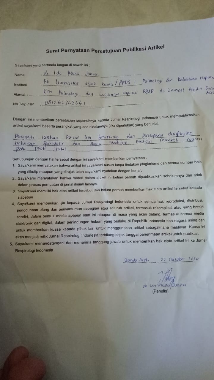 - The authors own the copyright of published articles. Nevertheless, Jurnal Respirologi Indonesia has the first-to-publish license for the publication material.